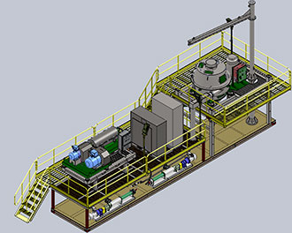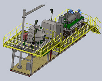 工作时候,将钻屑甩干机和钻井液离心机的支架升高到最高处,能够满足钻屑甩干机的钻屑排放,以及 钻井液离心机的液相和固相排放,液相的排放可以直接通过重力作用将干净泥浆流入到储浆罐或固控系 统中去。