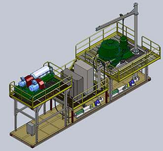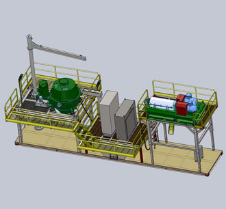 工作时候,将钻屑甩干机支架升高到最高处,能够满足钻屑甩干机的钻屑排放。离心机放于翘座的罐体上, 排出的液相部分直接流入到底部的收集罐中,需要输送钻井液时候,可以通过一台输送泵进行输送或将 此罐体与相近高度的罐体进行连接。