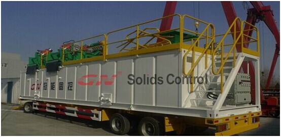 冠能150GPM泥浆系统配置如下 1、1台GNZS703D双层振动筛上安装了3个4寸除泥旋流器,通过GNZS703D双层筛可以把粗砂除去,然后通过除泥旋流器把20um左右以上的颗粒在分离除去, 2、2台GNSB4X3-12J的砂泵安装在泥浆罐斜仓上,1台用于给除泥器供浆,另外1台作为混浆泵使用。 3、4米长的泥浆罐,非常紧凑的设计跟合理的布局,对于狭小的钻井空间非常适宜。